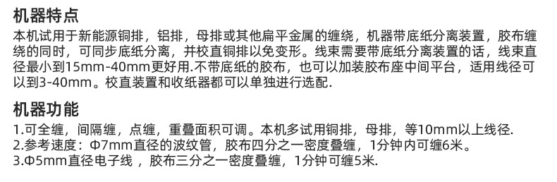 2.本机多试用铜排,母排,等 10mm 以上线径. 参考速度:Φ7mm 直径的波纹管,胶布四分之一密度叠缠,1 分钟内可缠 6 米。
