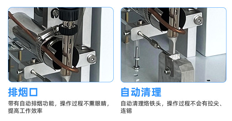 2.自动清理烙铁头,自动排烟,操作过程不会拉尖、连锡,不熏眼睛,提高效率;
